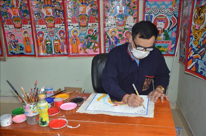 Ông Triệu Hùng Cường đang miệt mài vẽ những bộ tranh thờ với sự cẩn trọng, tỷ mỷ, và sự thấu hiểu về giá trị văn hóa của dân tộc mình qua mỗi bộ tranh. Ảnh: Hoa Mai - TTXVN