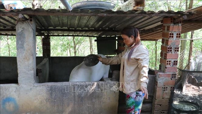 Chị Thị Hải (người dân tộc S’tiêng, sống tại khu định canh định cư làng 61) thái rau nuôi lợn để tăng nguồn thu nhập. Ảnh: Sỹ Tuyên – TTXVN