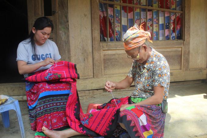 Trước kia, người Mông ở bản Suối Tôn chỉ biết đi rừng làm nương rẫy, chăn nuôi nhỏ lẻ, hiện nay, đồng bào đã biết đưa các nghề thủ công về làm, góp phần tăng thêm thu nhập, giữ gìn bản sắc văn hoá dân tộc. Ảnh: Bà Sùng Thị Chia cùng con gái thêu hoa văn trên vải thổ cầm. Ảnh: Khiếu Tư - TTXVN