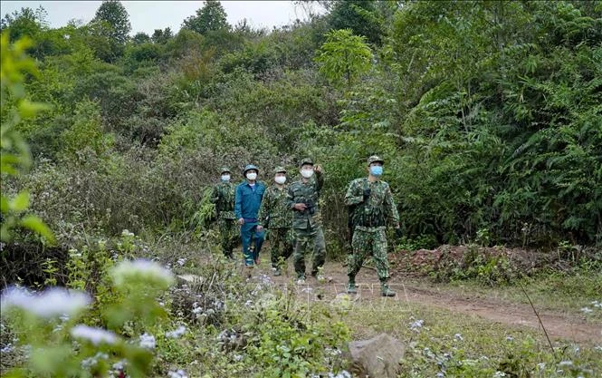 Chiến sĩ biên phòng thực hiện biện pháp phòng dịch đối với người dân qua lại khu vực biên giới. Ảnh: Xuân Tư – TTXVN
