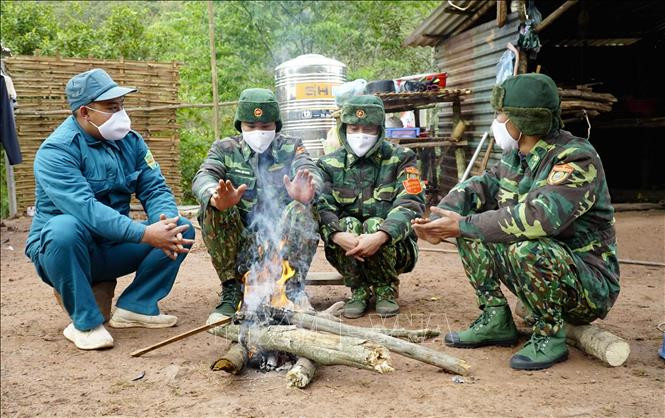 Chiến sĩ biên phòng tại tổ chốt kiểm soát dịch COVID-19 phải đốt lửa để sưởi ấm khi nhiệt độ xuống thấp. Ảnh: Xuân Tư – TTXVN