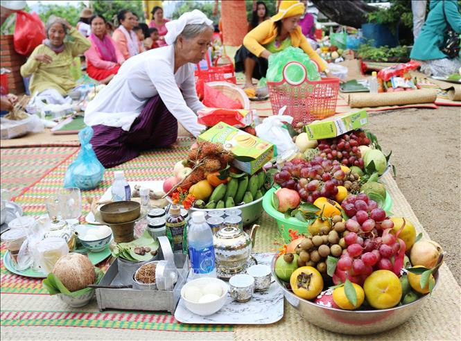 Đồng bào Chăm theo đạo Bà-la-môn sửa soạn lễ vật cúng các vị thần. Ảnh: Nguyễn Thành - TTXVN