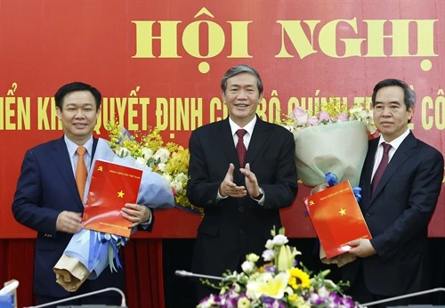 Đồng chí: Đinh Thế Huynh trao duyết định của Bộ chính trị cho đồng chí Đồng chí Vương Đình Huệ (bên trái) và đồng chí Nguyễn Văn Bình (bên phải), Ảnh: An Đăng- TTXVN