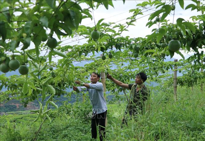 Người dân bản Nậm Cung 2, xã Mường Khoa chăm sóc vườn chanh leo - một trong những loại cây chuyển đổi cơ cấu cây trồng, giúp tăng thu nhập, vươn lên thoát nghèo. Ảnh: Quý Trung - TTXVN