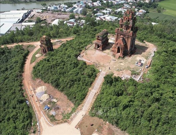 Toàn cảnh Tháp Bánh Ít đang được thi công xây dựng, tu bổ, tôn tạo. Ảnh: TTXVN