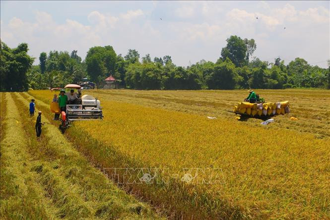 Thu hoạch lúa Hè Thu sớm tại huyện Vị Thủy, tỉnh Hậu Giang. Ảnh: Duy Khương- TTXVN