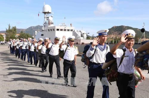| Cán bộ chiến sỹ hải quân phấn khởi lên đường ra nhận nhiệm vụ tại huyện đảo Trường Sa. Ảnh: Quang Quyết - TTXVN |