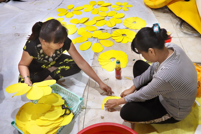 Nghệ nhân kết cành hoa mai tại xưởng Công ty TNHH Tnhh Sản Xuất Mỹ Thuật Văn Tòng (Thạnh Lộc, Quận 12, TP.HCM)
