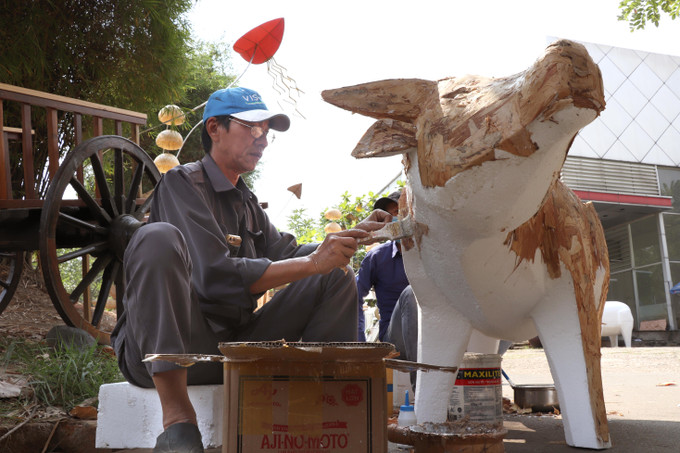 Ông Phan Long Mẹt, chủ xưởng Công ty TNHH Sản Xuất Mỹ Thuật Văn Tòng (Thạnh Lộc, Quận 12, Thành phố Hồ Chí Minh), cho biết: Đặc biệt là linh vật cảnh con trâu nước, phải chọn chất liệu tốt - xốp dẻo thay cho xốp thường của những năm trước, có chét nhựa chống thấm nước trong vòng một tháng. Thời gian để hoàn thiện một con trâu là từ 3 đến 4 ngày, tùy theo kích cỡ trâu to hay nhỏ. Các nghệ nhân đang tất bật làm việc để hoàn thành biểu tượng linh vật của năm Tân Sửu - Trâu, hiện đã hoàn tất được 70%.