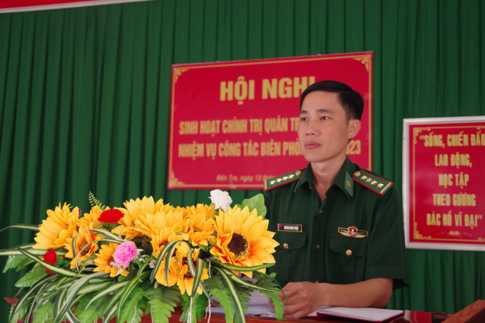Đại úy Dương Minh Thiện - Chính trị viên Đồn biên phòng Hàm Luông, Bội đội Biên phòng tỉnh Bến Tre trong một buổi sinh hoạt chính trị tại đơn vị. Ảnh: Chương Đài - TTXVN