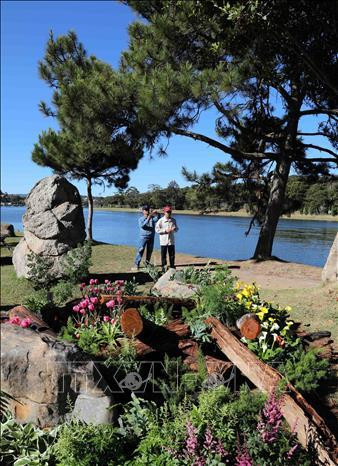 | Người dân Đà Lạt thưởng thức không gian hoa xung quanh hồ Xuân Hương. Ảnh: Nhật Anh - TTXVN |