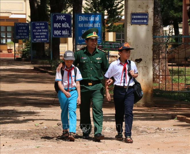 Trung úy Rơ Chăm Tuyn, Đồn biên phòng Cửa khẩu quốc tế Lệ Thanh đón các em đi học về. Ảnh: Hồng Điệp - TTXVN