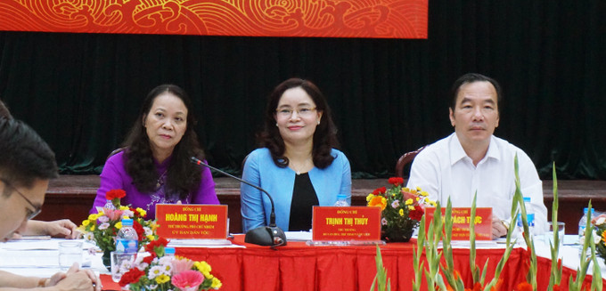 Phó Chủ tịch Ủy ban Trung ương Mặt trận Tổ quốc Việt Nam Ngô Sách Thực; Thứ trưởng Bộ Văn hóa, Thể thao và Du lịch Trịnh Thị Thủy; Thứ trưởng, Phó Chủ nhiệm Ủy ban Dân tộc Hoàng Thị Hạnh đồng chủ trì Hội nghị. Ảnh: Hoàng Tâm