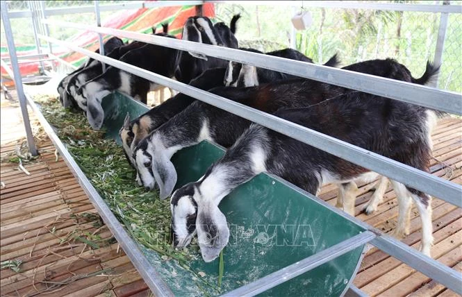 Mô hình nuôi dê bổ sung thêm thức ăn cỏ xay giúp dê mau lớn ở xã Phước Hải (huyện Ninh Phước, Ninh Thuận). Ảnh: Nguyễn Thành – TTXVN