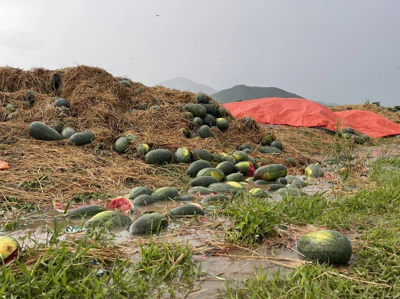 Dưa hấu trái vụ bị hư hại do mưa bão tại xã Phú Cần, huyện Krông Pa (Gia Lai). Ảnh: TTXVN phát