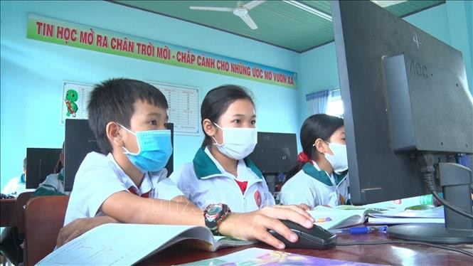 Học sinh Trường tiểu học Trần Phú, xã Tân An, huyện Đăk Pơ trong giờ tại phòng học thông minh. Ảnh: Hoài Nam - TTXVN