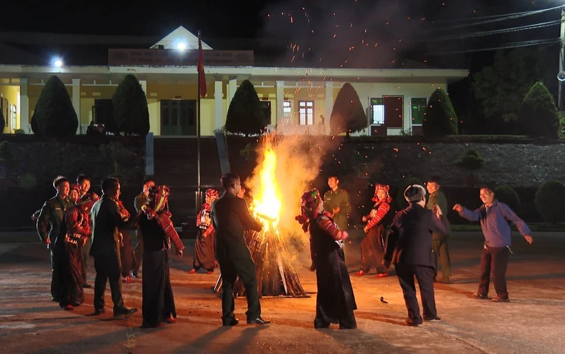 Già làng cùng cộng đồng dân tộc Hà Nhì và cán bộ, chiến sĩ Đồn Biên phòng A Pa Chải múa hát, mở rộng vòng xòe thắt chặt tình đoàn kết quân dân nơi biên cương cực Tây Tổ quốc. Ảnh: TTXVN