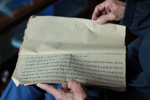 | Già làng Sầm Xuân Sinh là người gìn giữ nhiều hiện vật quý của đình làng Ngọc Tân, trong đó có cuốn Ngọc phả bằng chữ Hán. |