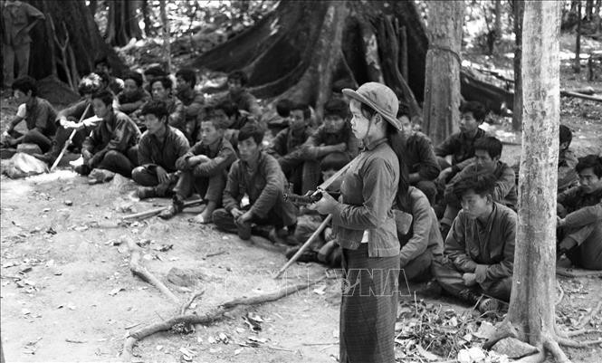 Cán bộ quân giải phóng giải thích chính sách khoan hồng của Mặt trận dân tộc giải phóng cho tù binh Ngụy. Trong chiến dịch Đường 9 - Nam Lào, quân ta loại khỏi vòng chiến đấu hơn 2 vạn tên địch, bắt hơn 1.000 tù binh. Ảnh: TTXVN