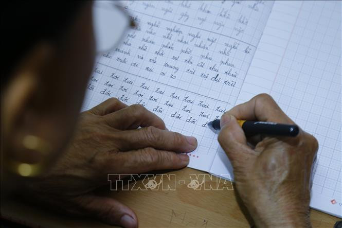 Các thầy cô giáo luôn tận tình hướng dẫn cho bà con học chữ. Ảnh: Nam Sương - TTXVN