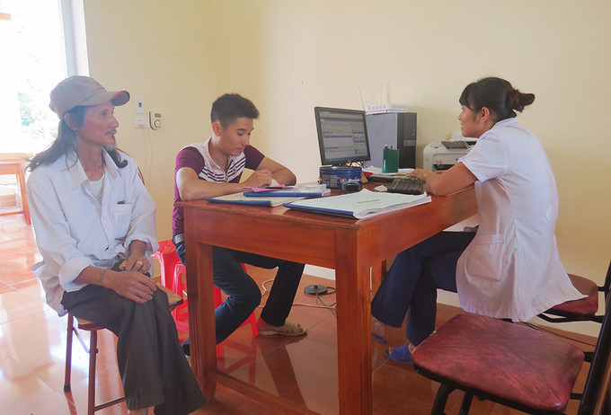 Cán bộ Trạm y tế xã Minh Đài, huyện Tân Sơn hướng dẫn người nghèo làm thủ tục đăng ký khám bệnh.Ảnh: baophutho.vn