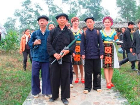 Áo của đàn ông Mông Trắng: khuy áo đơm theo nẹp tà trước ngực, cổ áo đứng, có viền những đường chỉ trắng hình ô quả trám.