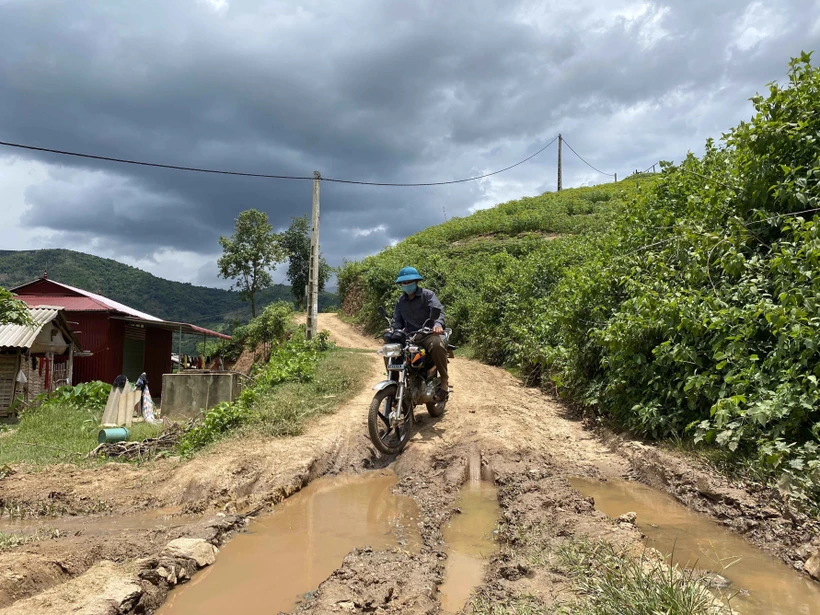 Một đoạn đường lầy lội trên tuyến đường từ trung tâm xã Chiềng Nơi đến các bản. Ảnh: Hữu Quyết - TTXVN