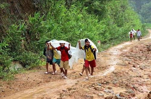 | Học sinh đội mưa, vượt đường trơn trượt tới trường dự Lễ khai giảng năm học mới. Ảnh: Việt Hoàng – TTXVN |