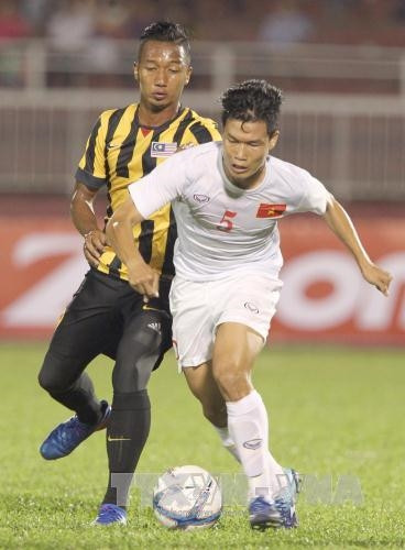 | Pha tranh bóng giữa cầu thủ hai đội. Ảnh: Quang Nhựt - TTXVN. |