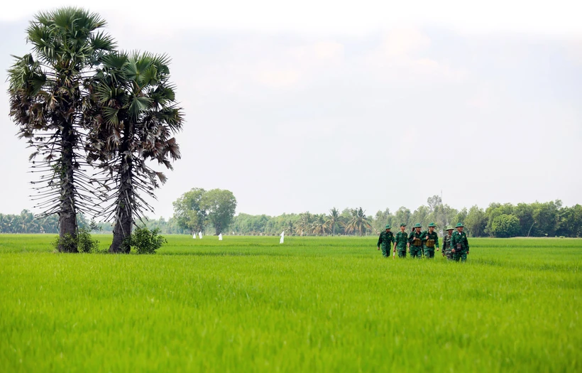 Bộ đội Biên phòng tỉnh Tây Ninh tuần tra khu vực đồng ruộng giáp biên giới. Ảnh: Giang Phương