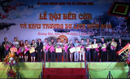 | Lãnh đạo thị xã Hoàng Mai tặng hoa cho các đơn vị tài trợ tại Lễ khai hội Đền Cờn. Ảnh: Tá Chuyên – TTXVN |