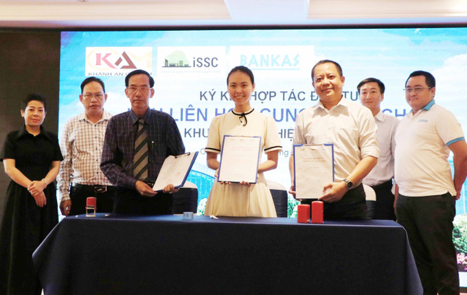 Các doanh nghiệp ký kết tiêu thụ sản phẩm OCOP Cà Mau. Ảnh: Kim Há-TTXVN