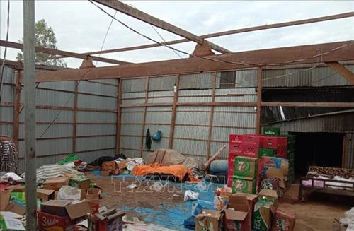 | Một căn nhà ở xã Thới Sơn, huyện Tịnh Biên bị giông lốc làm tốc mái một phần. Ảnh: Công Mạo-TTXVN |