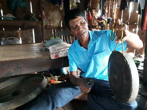 Lần theo sự chỉ dẫn và tiếng chiêng ngân vang, chúng tôi tìm đến nhà ông Gúk. Lúc này, trước căn nhà sàn gỗ đang có hơn chục người tạo thành vòng tròn, vừa đi vừa đánh chiêng. Tiếng chiêng vang vọng, lan tỏa cả 1 vùng đồi núi. Bản nhạc kết thúc, ông Gúk lấy cái búa sắt nhỏ gõ liên tiếp lên khắp mặt cái chiêng lớn. Ông Gúk tiếp tục kê chiêng lên đế gỗ, dùng búa và thanh sắt bắt đầu “chỉnh giọng” cho chiêng.