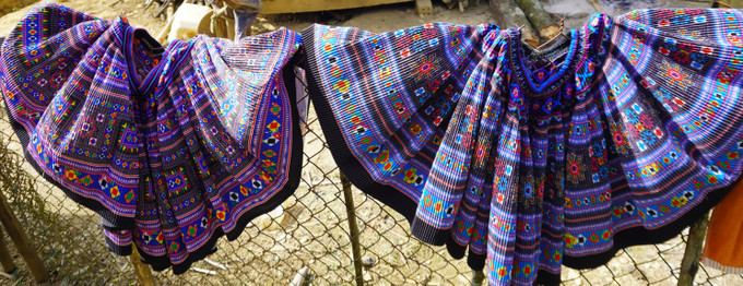 Theo lời kể của bà Sùng Y Mái ở xóm Chà Đáy, xã Pà Cò chia sẻ về quá trình làm nên được một chiếc váy của đồng bào Mông rất cầu kỳ và thú vị. Một chiếc váy Mông được làm từ 6 -7 m vải lanh. Để làm ra một tấm vải lanh phải trải qua rất nhiều công đoạn. Lanh được cắt từ rừng về phơi khô, giã cho mềm rồi mới nối. Trước khi dệt vải, sợi lanh được đem ngâm tro bếp trắng, tro càng trắng bao nhiêu đem ngâm vải lanh càng trắng bấy nhiêu. Lúc đó mới bắt đầu dệt vải. Để miếng vải có được màu trắng tinh giúp chàm bám chắc hơn khi nhuộm thì phải giặt, phơi, sau đó mang đi lu cho mặt vải bóng mịn.