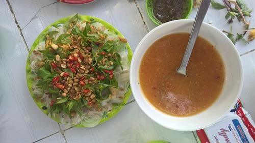 Điều khác biệt thu hút du khách khi thưởng thức món ăn này có lẽ là ở nước chấm bởi nó mang đến hương vị rất đặc trưng không nhầm lẫn. Nước chấm cá mai tương đối cầu kỳ, sền sệt rất hấp dẫn và thơm mùi của me, chuối chín, tỏi và ớt. Khi ăn có thể cuốn bánh tráng cùng khế, chuối xanh, dưa leo, xà lách…