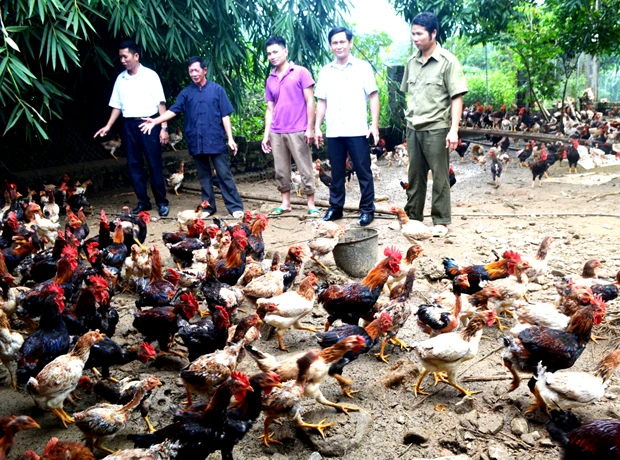Chăn nuôi gà theo hướng gia trại giúp anh Mương Văn Lực (giữa), thôn Bản Đén, xã Tùng Bá , huyện Vị Xuyên) thu nhập ổn định. Ảnh: baohagiang.vn