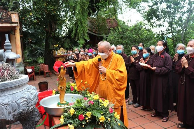 Nghi thức tắm phật tại Lễ Phật đản ở Chùa Sùng Khánh (xã Đạo Đức, huyện Vị Xuyên, Hà Giang). Ảnh: Minh Tâm - TTXVN