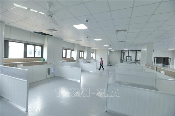Khu điều trị phổ thông tại bệnh viện dã chiến chuẩn bị được hoàn thiện. Ảnh: Minh Quyết - TTXVN