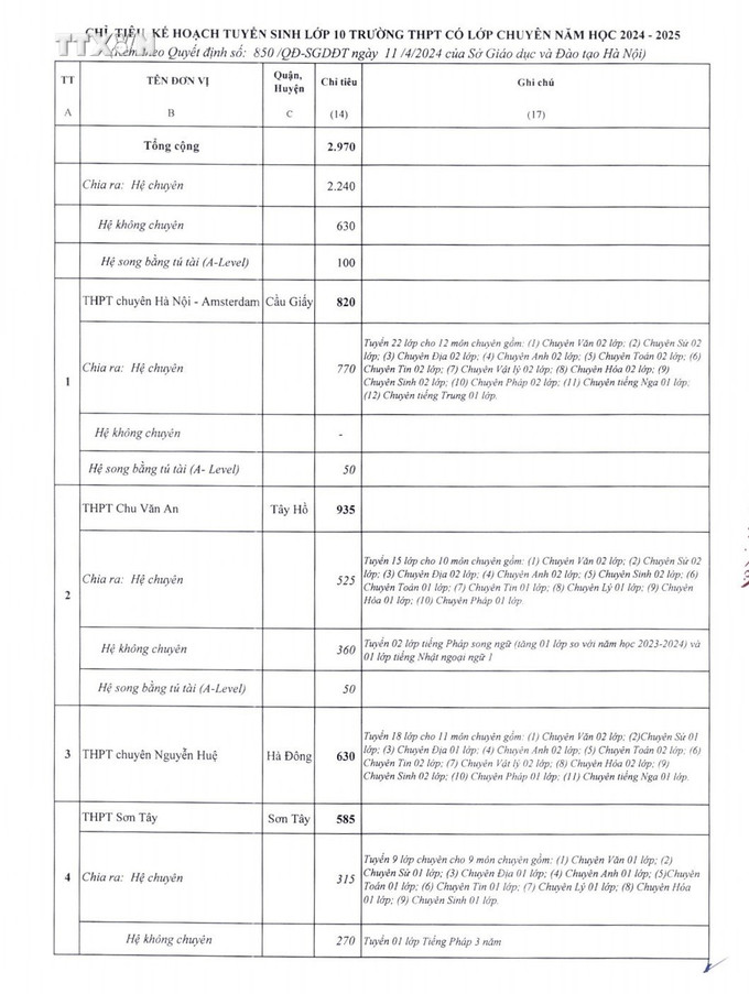 Nhóm trường Trung học phổ thông chuyên và có lớp chuyên, trường Chu Văn An tuyển cao nhất với 935 học sinh (hệ chuyên 525 em, hệ không chuyên 360 em và song bằng 50 em); Chuyên Hà Nội - Amsterdam tuyển 820 học sinh (hệ chuyên 770 em và song bằng 50 em); Chuyên Nguyễn Huệ tuyển 630 học sinh (18 lớp cho 11 môn chuyên); Sơn Tây tuyển 585 học sinh (hệ chuyên 315 em và hệ không chuyên 270 em).