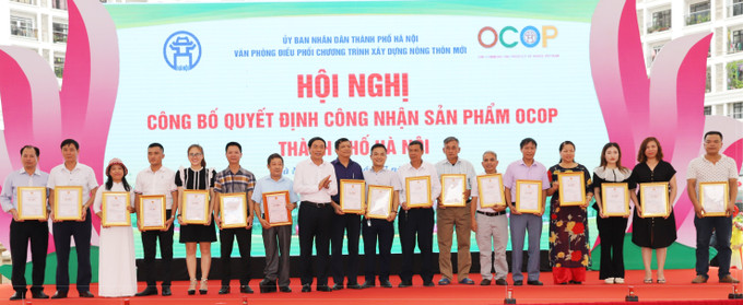 Ông Chu Phú Mỹ, Giám đốc Sở Nông nghiệp và Phát triển nông thôn Hà Nội kiêm Chánh Văn phòng Điều phối chương trình xây dựng nông thôn mới thành phố Hà Nội trao quyết định công nhận sản phẩm OCOP cho các chủ thể.
