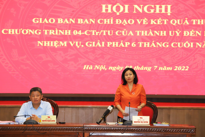 Phát biểu kết luận hội nghị, Ủy viên Trung ương Đảng, Phó Bí thư Thường trực Thành ủy Hà Nội, Trưởng ban Chỉ đạo Chương trình số 04-CTr/TU Nguyễn Thị Tuyến biểu dương, ghi nhận, đánh giá cao những kết quả xây dựng nông thôn mới của các địa phương đã đạt được trong quý II/2022. Nhấn mạnh các nhiệm vụ trọng tâm cần triển khai trong 6 tháng cuối năm, Phó Bí thư Thường trực Thành ủy Hà Nội Nguyễn Thị Tuyến đề nghị bám sát những chỉ đạo mới của Trung ương về xây dựng nông thôn mới, nông thôn văn minh, hiện đại; những định hướng lớn về phát triển nông nghiệp, nông thôn được thể hiện tại Nghị quyết số 15-NQ/TƯ ngày 05/5/2022 của Bộ Chính trị (khóa XIII) về “Phương hướng, nhiệm vụ phát triển Thủ đô Hà Nội đến năm 2030, tầm nhìn đến năm 2045”.