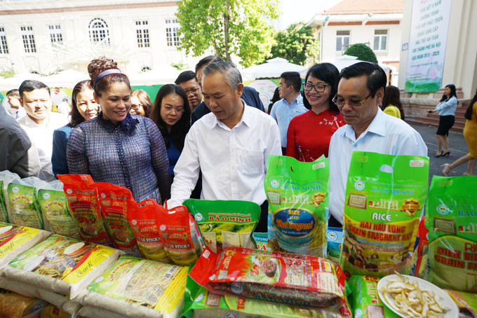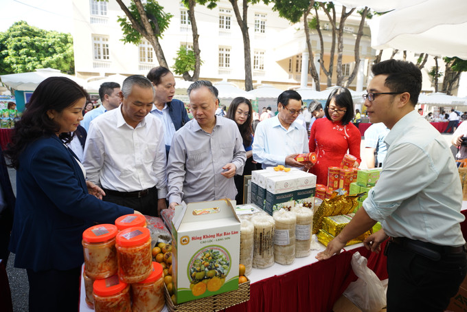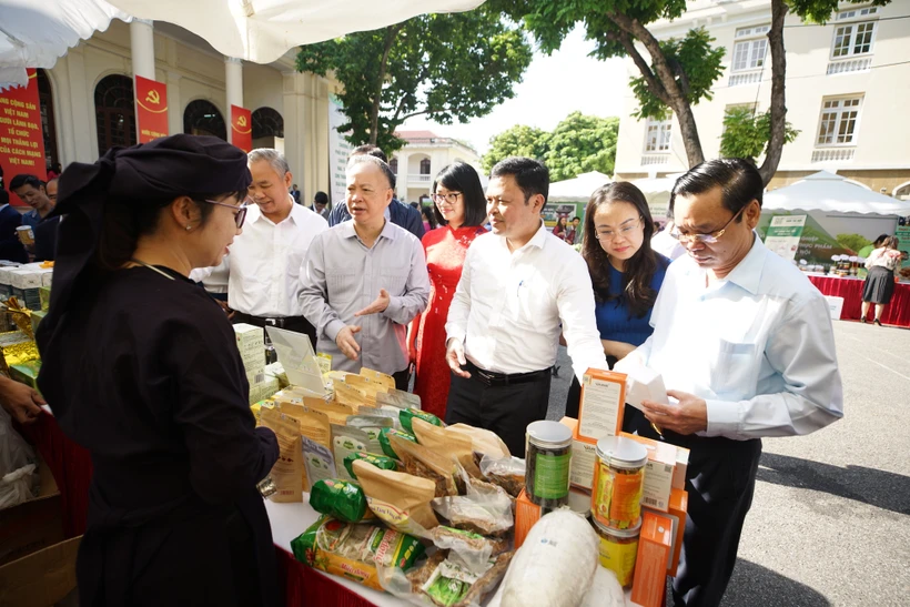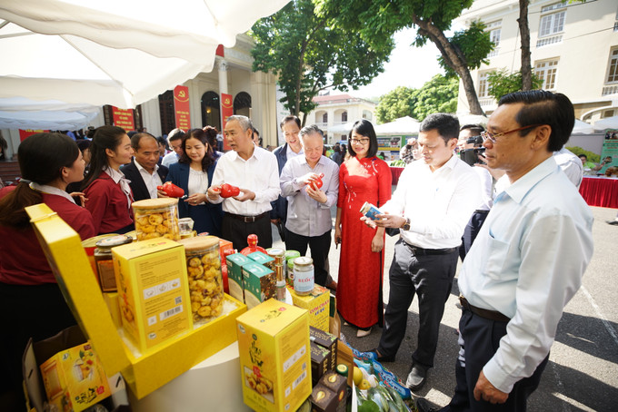 Phó Chủ tịch thường trực Ủy ban Nhân dân Thành phố Hà Nội Nguyễn Văn Sửu cùng đại diện Bộ Nông nghiệp và Phát triển nông thôn, lãnh đạo các Sở, Ban, Ngành trên địa bàn thành phố… tham quan khu trưng bày các chuỗi cung cấp rau, thịt an toàn cho thành phố Hà Nội.