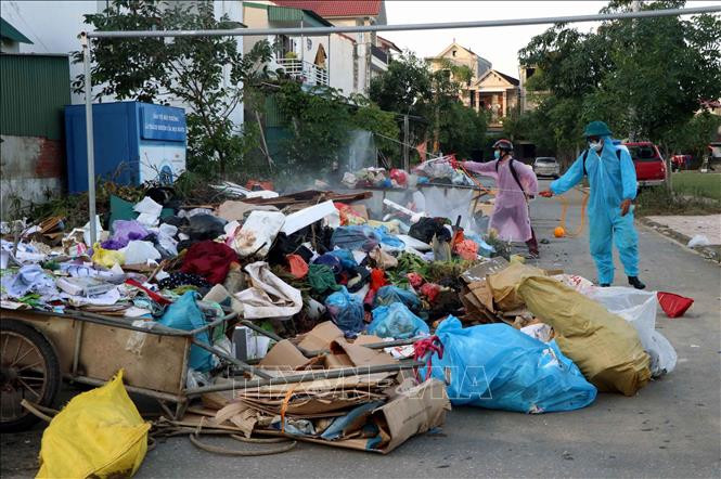 Lực lượng Y tế phun hóa chất diệt khuẩn tại các khu dân cư, đường làng, ngõ xóm. Ảnh: Công Tường-TTXVN