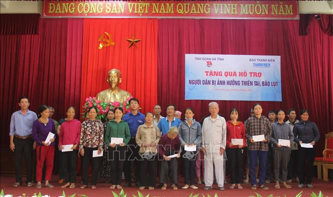 Tỉnh đoàn Hà Tĩnh đã phối hợp với Báo Thanh niên trao tặng 100 suất quà trị giá 100 triệu đồng cho nhân dân bị ảnh hưởng lũ lụt tại xã Thạch Đài huyện Thạch Hà (Hà Tĩnh). Ảnh: Hoàng Ngà - TTXVN