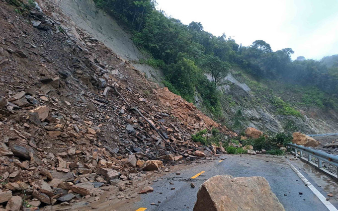 Điểm sạt lở trên Quốc lộ 8A đoạn qua xã Sơn Kim I, huyện Hương Sơn. Ảnh: TTXVN phát