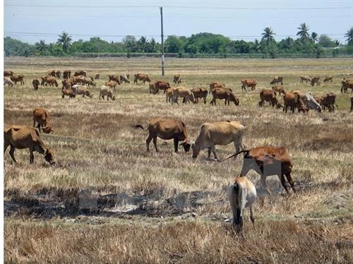 | Đàn cừu cố tìm cỏ để ăn trong mùa khô hạn. Ảnh: Công Thử - TTXVN |