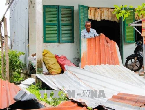 | Người dân dọn dẹp và sửa chữa nhà cửa sau trận giông. Ảnh: Hồng Thái - TTXVN |
