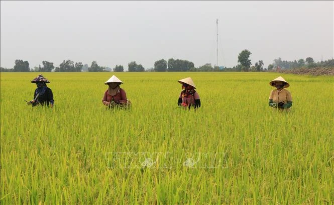 Đội khử lẫn cắt lúa lộn, lúa cỏ… trong ruộng lúa để đảm bảo chất lượng lúa giống cung cấp cho các công ty. Ảnh: Nhựt An - TTXVN