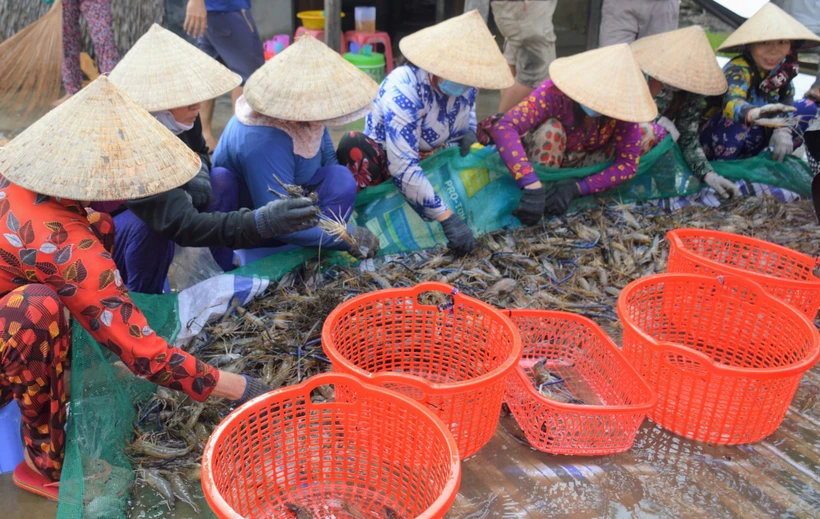 Bà con nông dân tổ chức phân loại tôm càng xanh trước khi đưa ra thị trường. Ảnh: Tuấn Kiệt